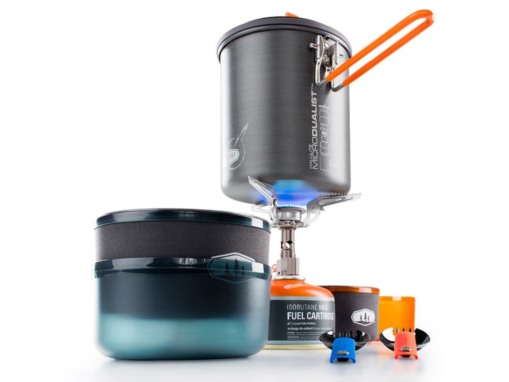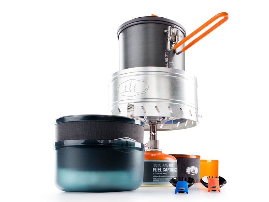 Kompaktní, lehká sada nádobí s plynový vařičem GSI Outdoors Pinnacle Canister Stove, pro dvě osoby, z nejlehčí řady Halulite. Do sady lze umístit také plynovou kartuši GSI Outdoors Isobutane Fuel 110g, která však není součástí balení.